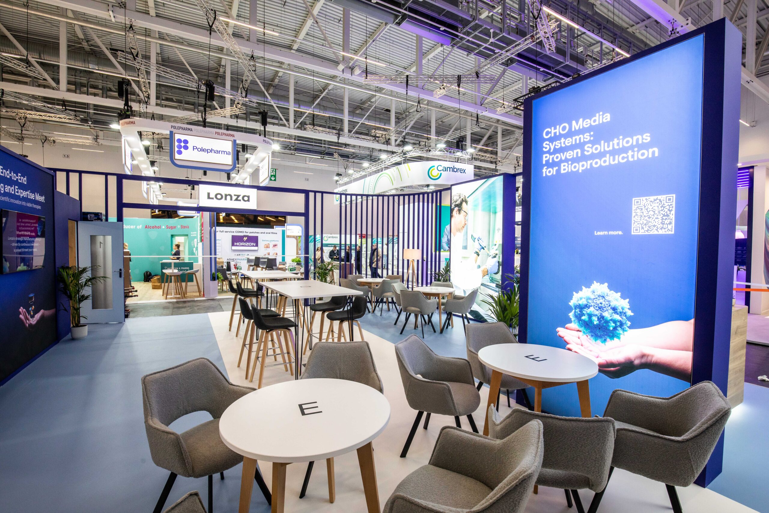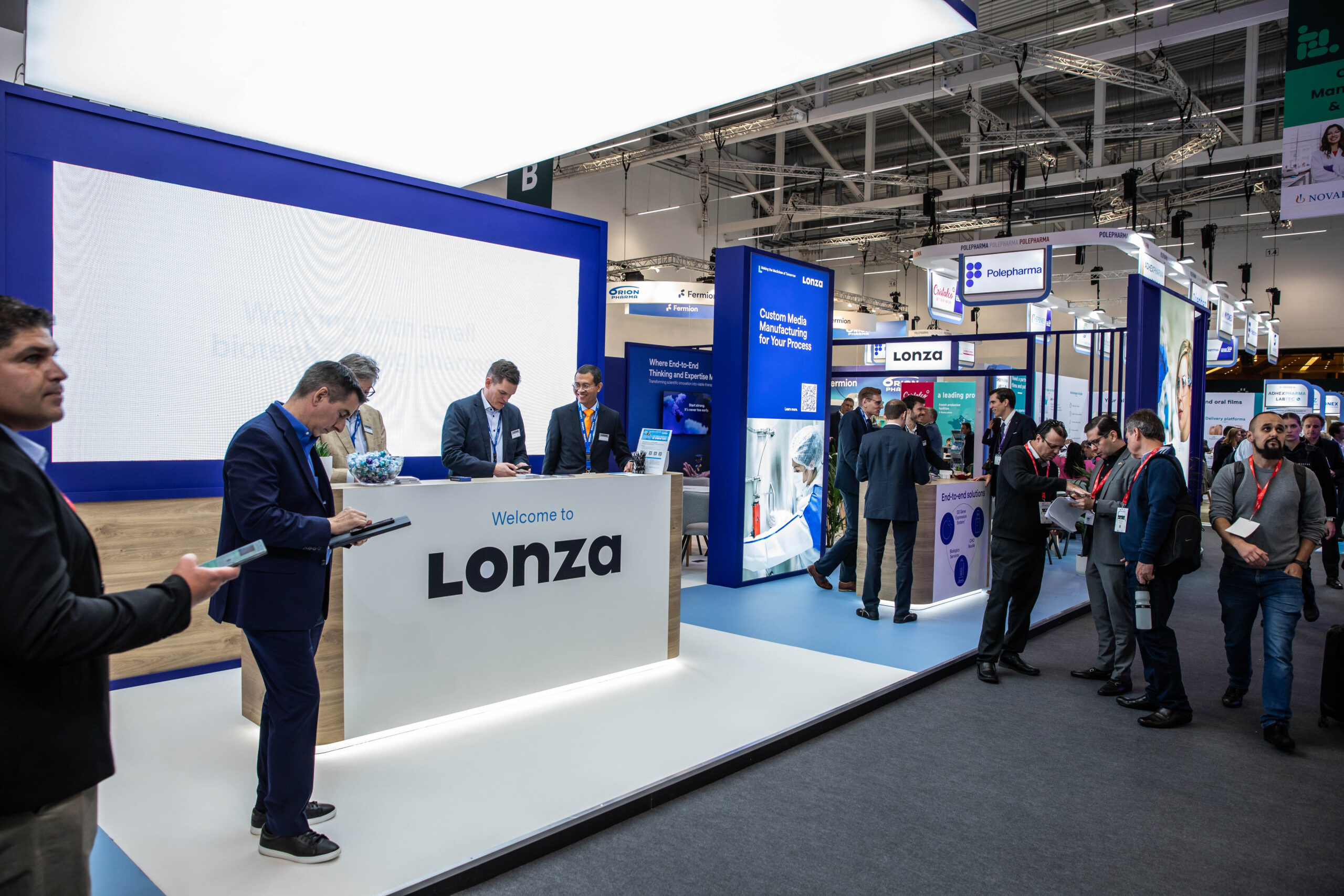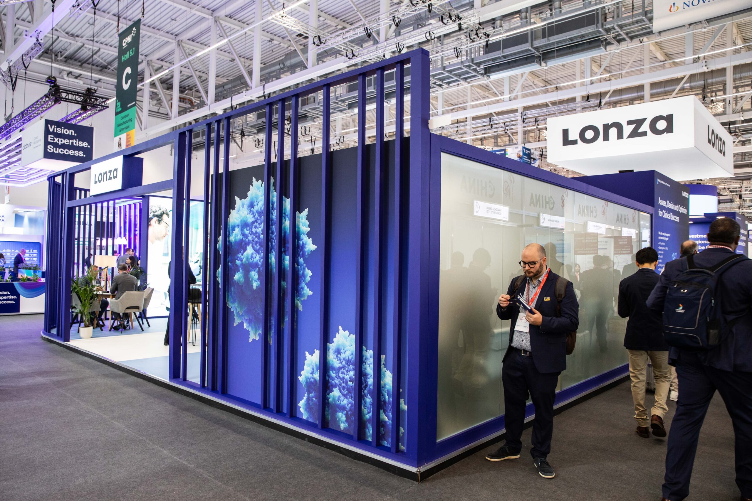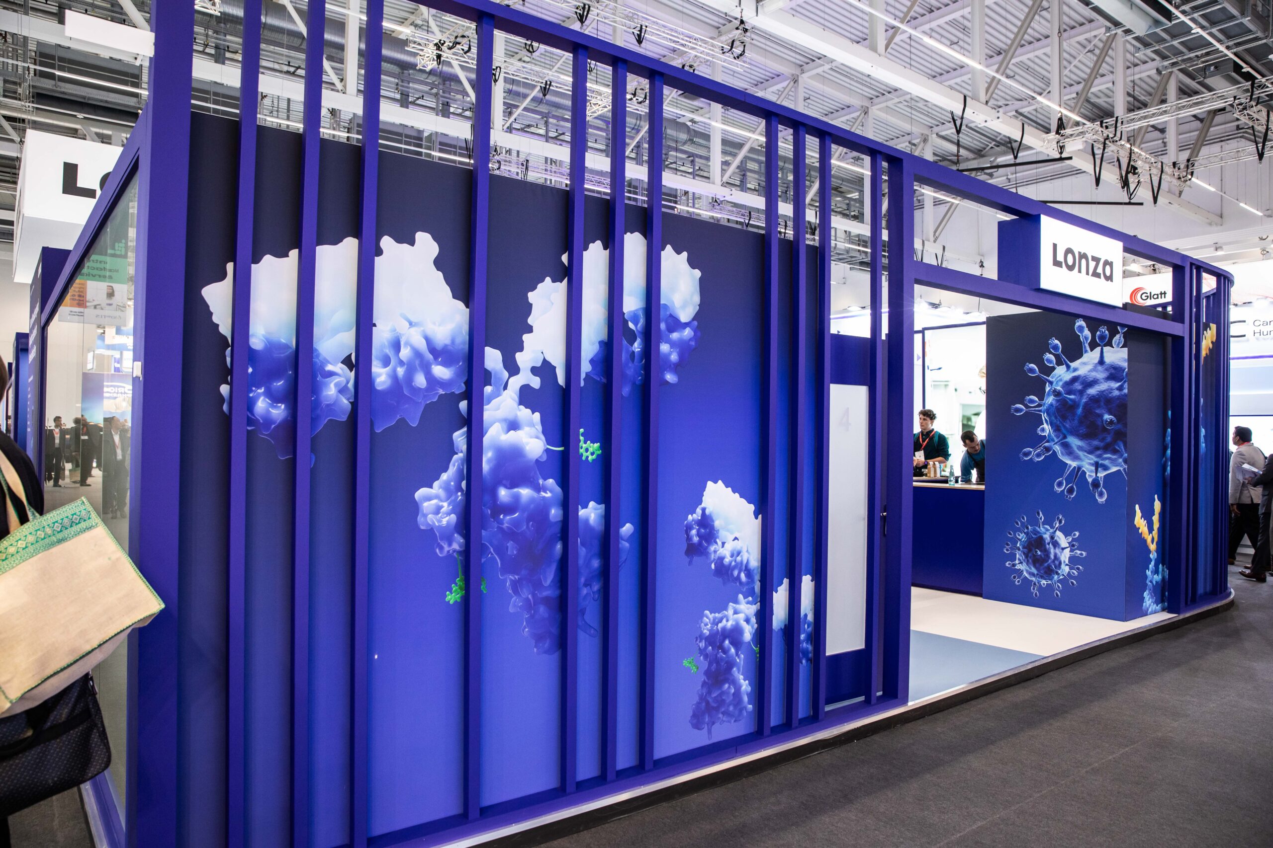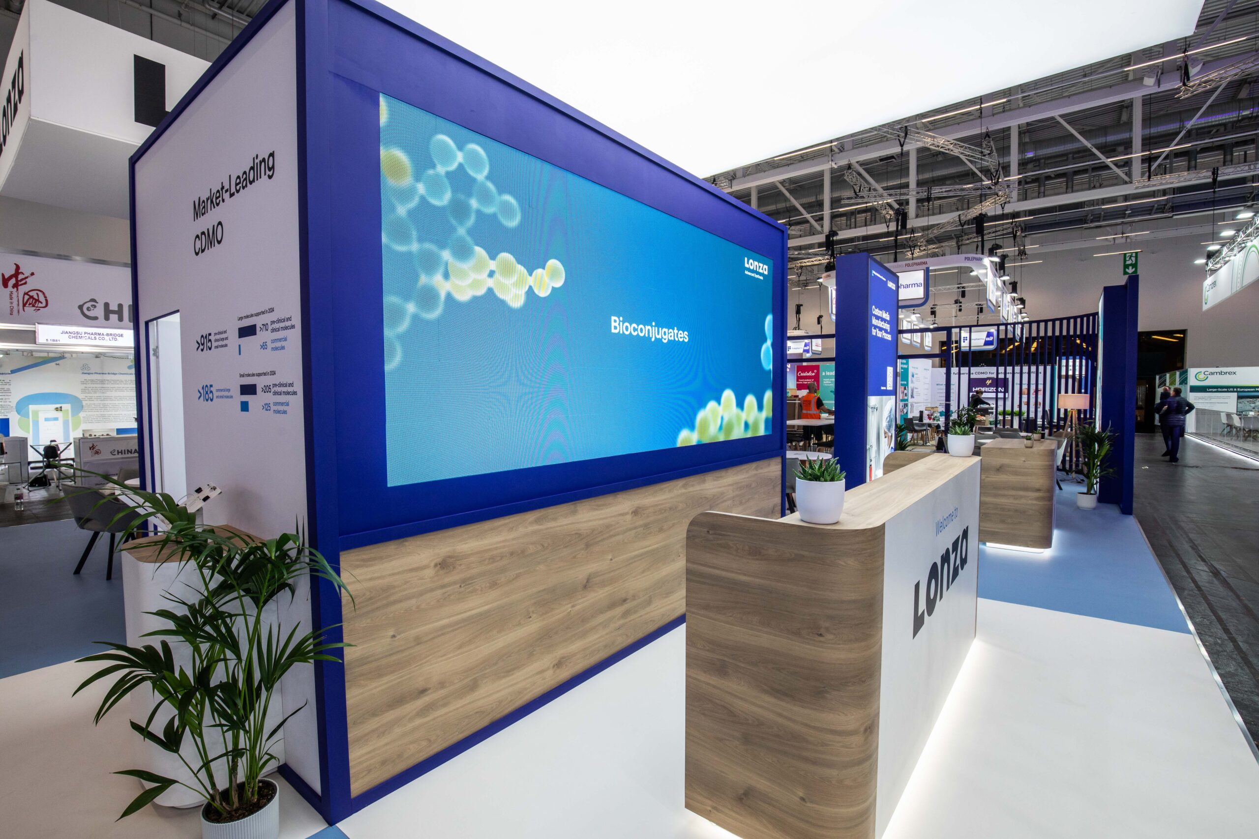 The key to success with the Lonza exhibition stand design, is balancing the visibility and messaging of its different business units to give a consistent view of the business to visitors on the stand.